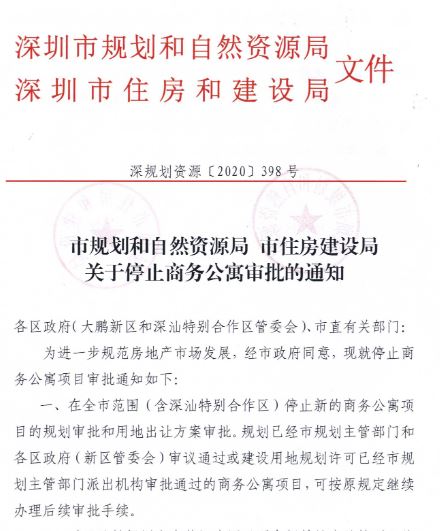 2020年7月31日,深圳市规划和自然资源局、深圳市住房和建设局发布《关于停止商务公寓的审批通知》。通知提出全市范围(含深汕特别合作区)停止新的商务公寓项目审批,鼓励已批商务公寓项目转为可售型人才房,减少商业用地比例,增加居住及配套用地比例等内容。