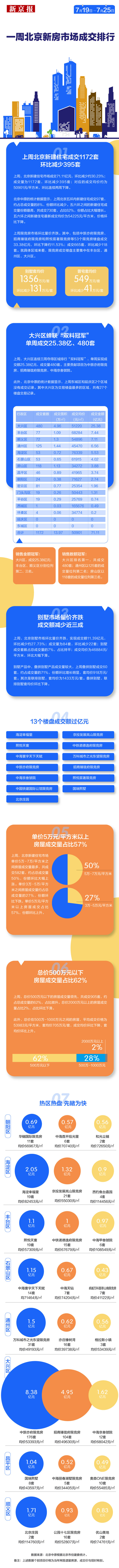 上周,北京新建住宅市场“遇冷”,成交量回落至1172套,成交额环比下跌超三成。根据北京中原的统计数据,上周(7月19日-7月25日),北京新建住宅市场(不包括回迁房,剔除共有产权房,含普通住宅+高端住宅+别墅)共成交71.11亿元,环比减少约30.23%;上周成交1172套,环比减少395套;对应的成交均价约为50901元/平方米,环比每平方米下降2814元。