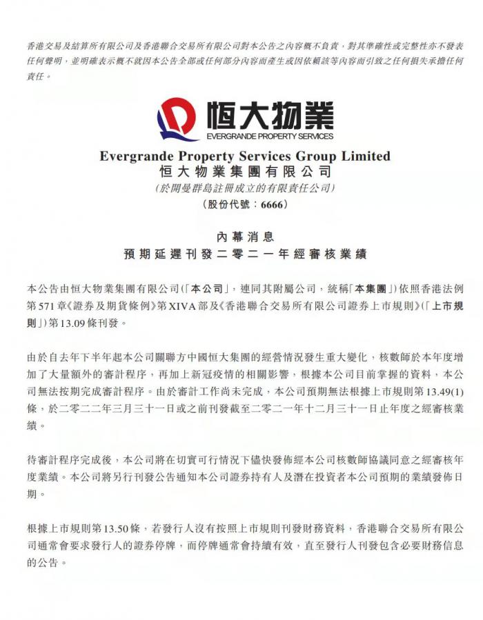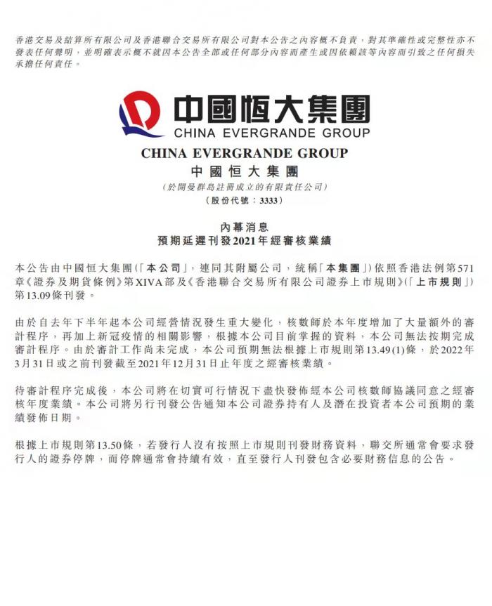 由于审计工作尚未完成,中国恒大预计无法根据相关上市规则于2022年3月31日或之前刊发截至2021年12月31日止年度之经审核业绩。