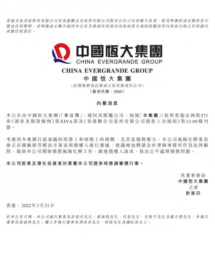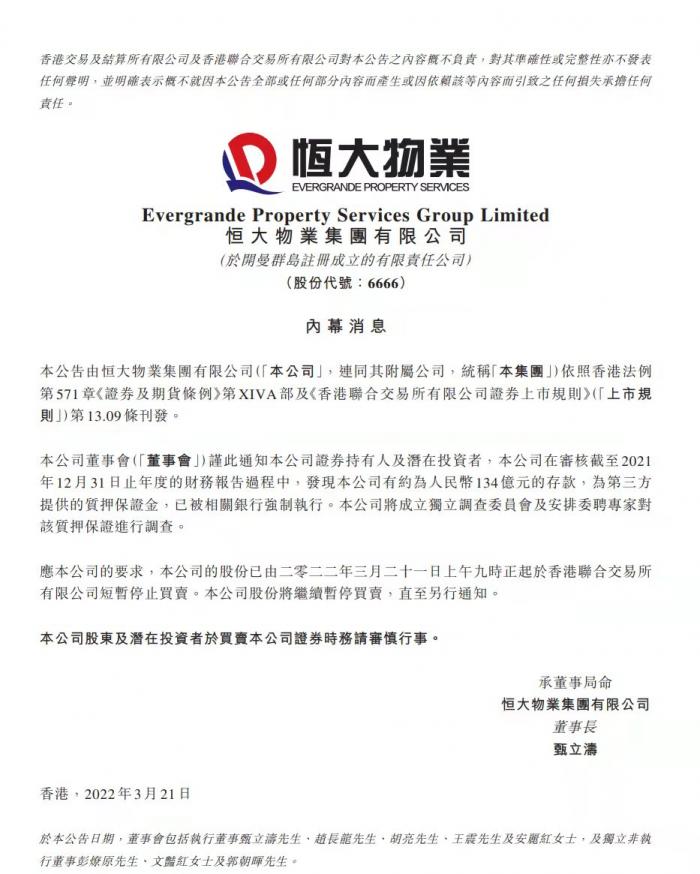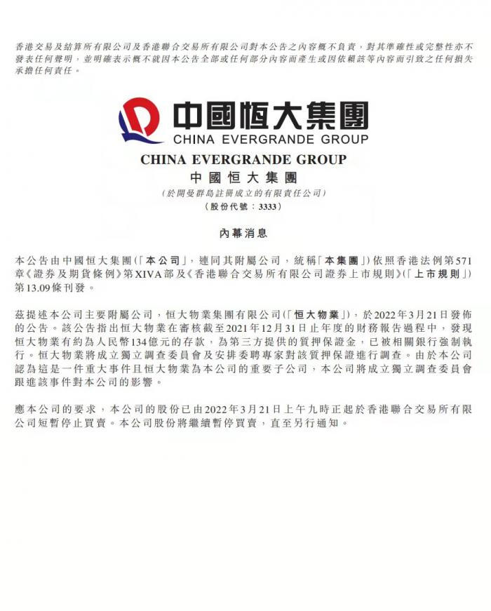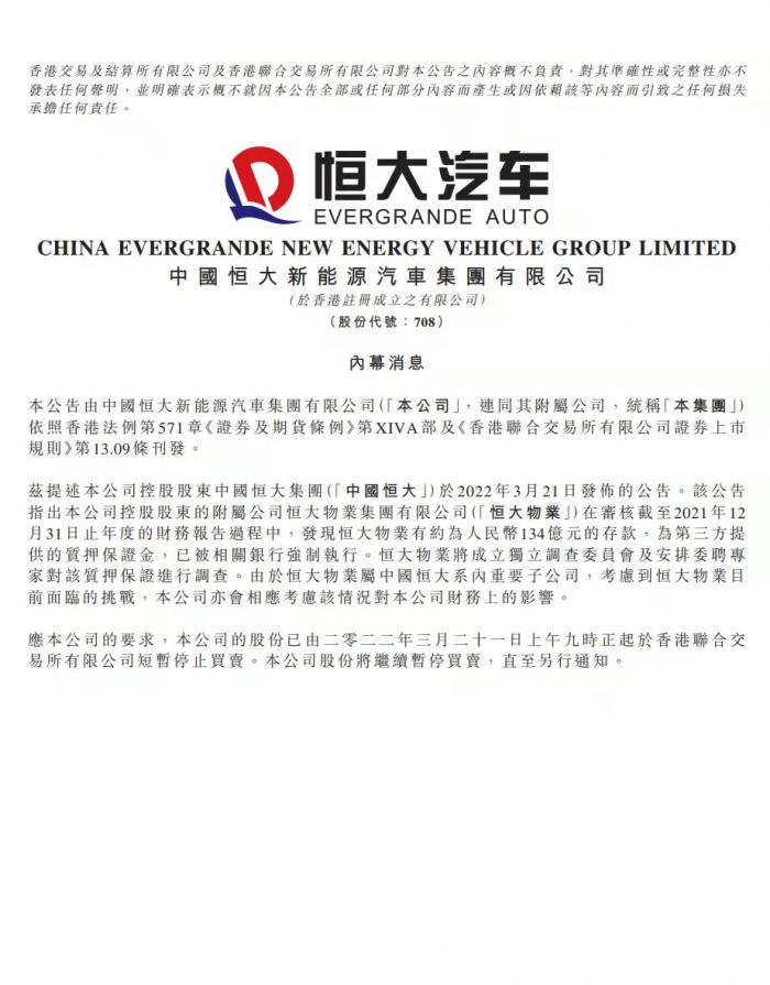 中国恒大、恒大物业和恒大汽车已于2022年3月21日公告在港交所暂停交易。22日起继续停牌。恒大地产所有存续公司债券也已自2022年3月21日开市起停牌。