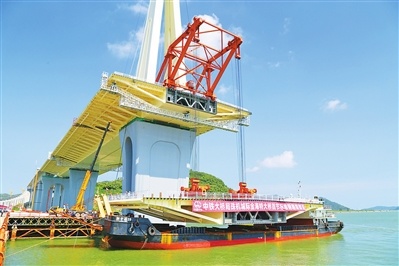 为保证钢梁连接质量,降低海上施工时间,减少现场高空作业风险,施工中首创斜拉桥两节段24米长钢箱梁悬拼新技术。同时确保吊装的安全性和精准度,中铁大桥局还专门研发制造了750吨架梁吊机,为标准节段钢梁顺利架设打下了坚实的基础。