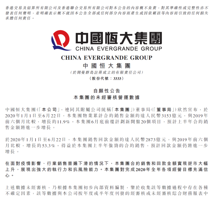 6月24日,中国恒大(3333.HK)发布较新公告,截至6月22日,恒大年内已实现销售3153亿,与2019年前六月相比增长11.9%。公司在6月底前还计划新开盘20个项目,预计上半年销售金额将进一步上涨。此外,恒大同期已实现销售回款2873亿,与2019年前六个月相比,大幅增长约53.3%,刷新了同期销售及回款较高历史纪录。