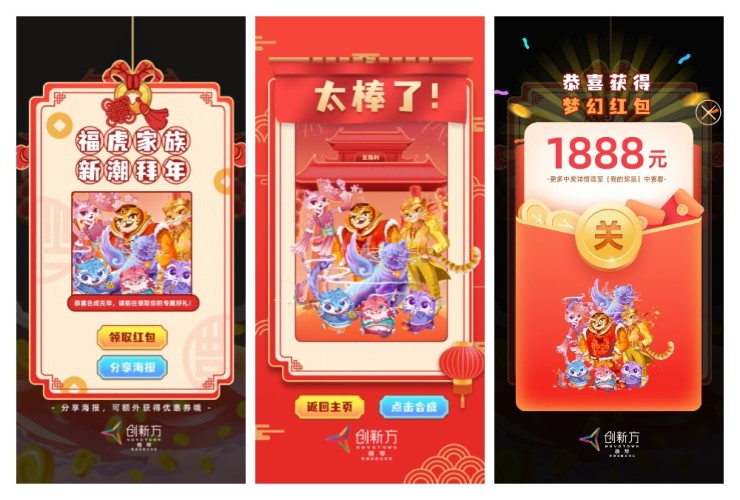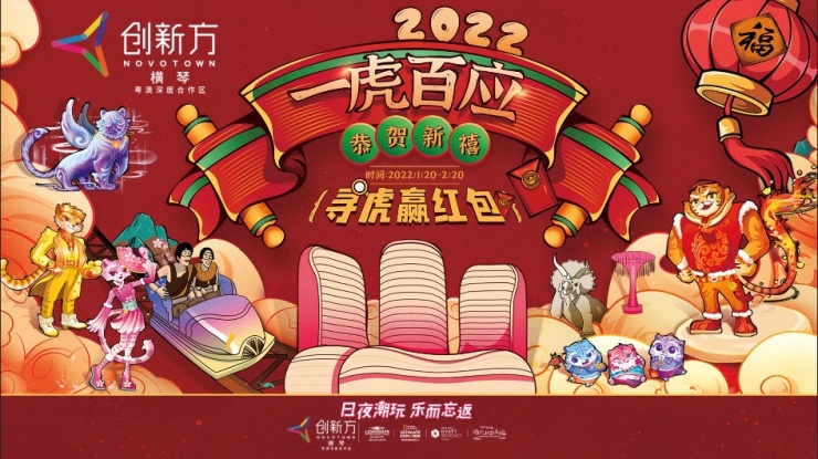 虎年全新推出“一虎百应 日夜潮玩”寻虎主题活动,将在“福虎家族”的加持下,具备了更多潮流玩法。春节期间,前来横琴创新方的每位游客将可踏上寻虎之旅,通过集齐火尾虎、健康虎、姻缘虎、财运虎以及隐藏梦幻虎即有机会获得大奖——梦幻红包,较高金额达1888元。