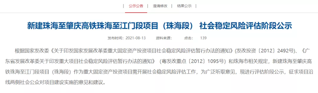 受珠海市轨道交通局委托,广东省国际工程咨询有限公司日前挂出《新建珠海至肇庆高铁珠海至江门段项目(珠海段) 社会稳定风险评估阶段公示》(以下简称《公示》),披露了珠肇高铁珠海到江门段暂定的线路走向及设站情况。