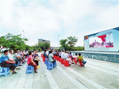 当天上午,在斗门区的101个行政村,党员、干部和群众早早端坐在“智慧一公里”项目“强国大屏”前,集中收看大会直播,认真聆听习近平总书记重要讲话。观看期间,白蕉镇月坑村下起小雨,但仍挡不住村民们观看的热情。斗门镇上洲村的老中青3名退役军人陈哺仔、余福华、余律峰在国歌奏毕后,整齐地向大屏方向敬军礼,眼神写满坚毅。