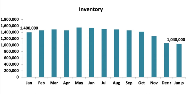 数据显示,截至今年1月底,美国共有104万套房屋出售,与去年12月相比跌了1.9%,同比下降25.7%。