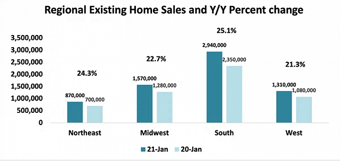 细分地区来看,今年1月美国四个地区的房价实现两位数的同比增幅。