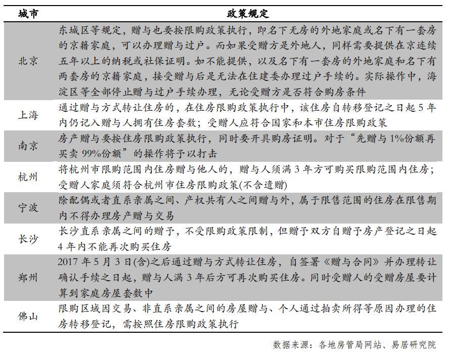 据易居研究院不完全统计,当前全国至少有8个重点城市落实了住房赠与纳入限购的政策,包括北京、上海、南京、杭州、宁波、长沙、郑州和佛山。