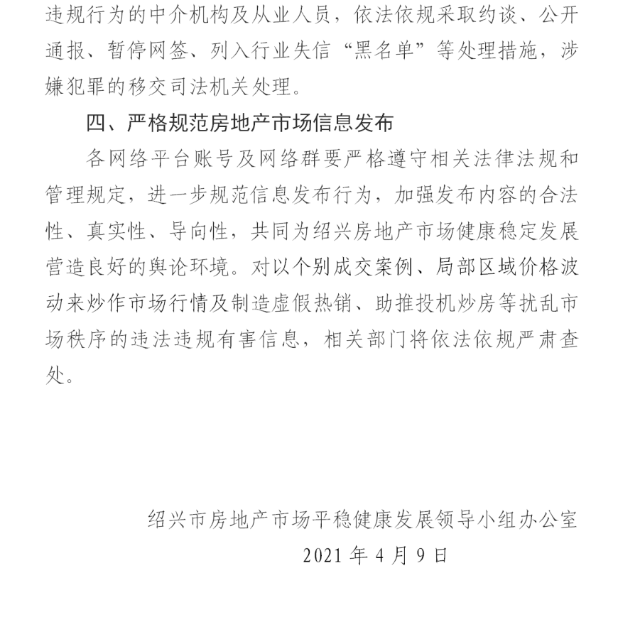 《通知》明确严格规范房地产市场信息发布。各网络平台账号及网络群要严格遵守相关法律法规和管理规定,进一步规范信息发布行为,加强发布内容的合法性、真实性、导向性,共同为绍兴房地产市场健康稳定发展营造良好的舆论环境。对以个别成交案例、局部区域价格波动来炒作市场行情及制造虚假热销、助推投机炒房等扰乱市场秩序的违法违规有害信息,相关部门将依法依规严肃查处。
