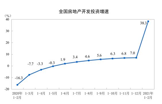 国家统计局数据显示,1-2月份,全国房地产开发投资13986亿元,同比增长38.3%;比2019年1-2月份增长15.7%,两年平均增长7.6%。其中,住宅投资10387亿元,增长41.9%。
