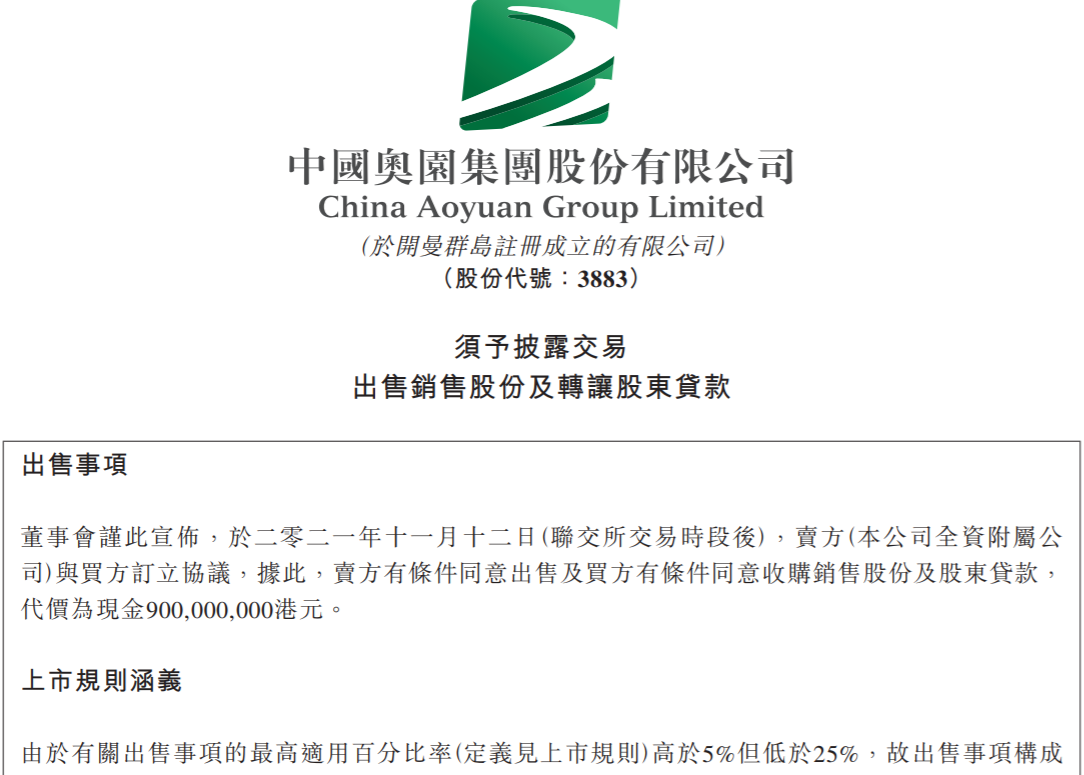 11月14日晚间,中国奥园(03883.HK)公告称,于11月12日,奥园地产香港与新永投资签订目标公司转让协议,新永投资将收购目标公司名万投资、双福及裕康的全部已发行股本,交易代价为9亿港元。