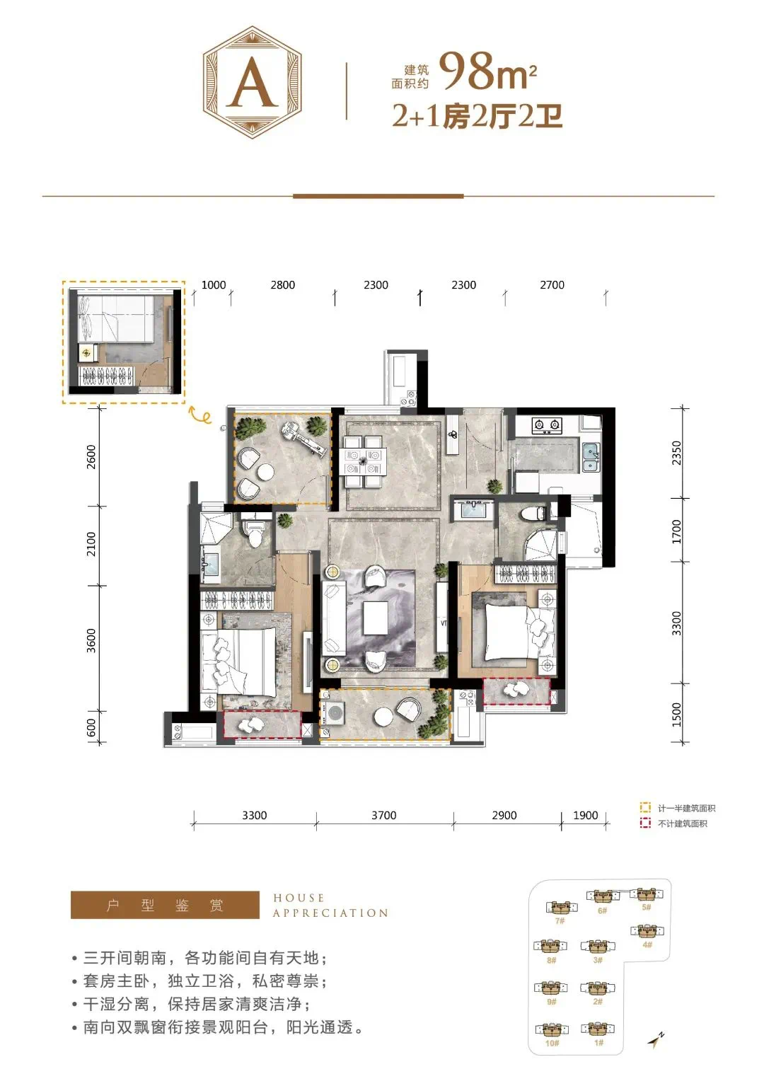 首次推售建面约98㎡和108㎡的2+1房世家美宅