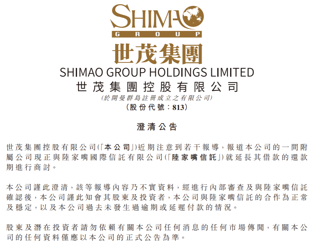世茂集团表示,“经进行内部审查及与陆家嘴信托确认后,本公司谨此知会其股东及投资者,本公司与陆家嘴信托的合作为正常及稳定,以及本公司过去未发生过逾期或延迟付款的情况。”