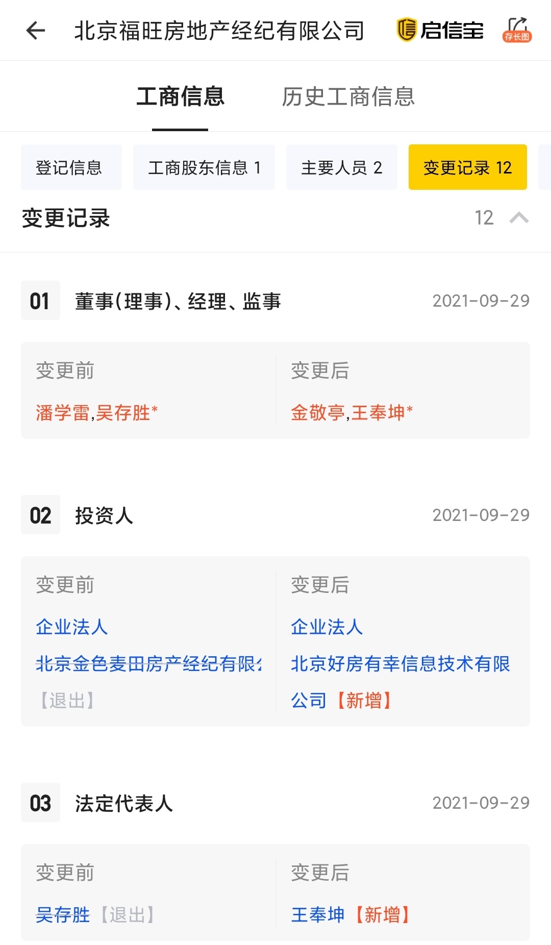 启信宝显示,9月29日,北京福旺房地产经纪有限公司(以下简称北京福旺)发生工商信息变更,北京金色麦田房地产经纪有限公司(以下简称北京麦田)退出,少有股东变成了北京好房有幸信息技术有限公司(以下简称北京好房有幸),而好房有幸正是字节跳动旗下公司。