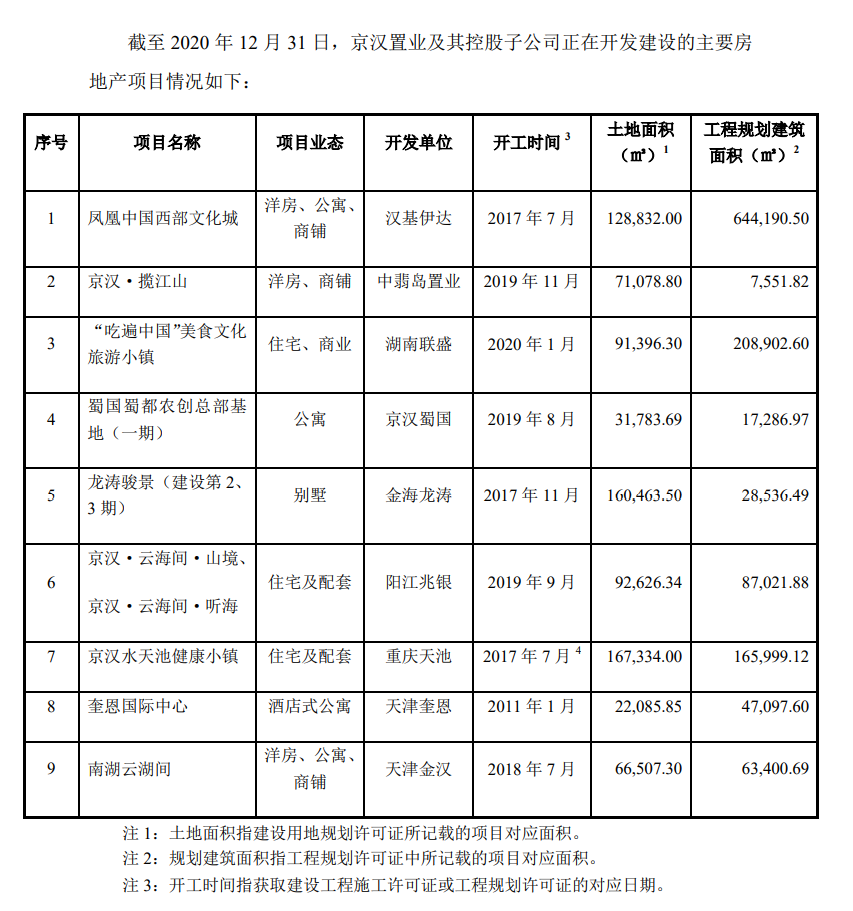 截至2020年12月31日,京汉置业及其控股子公司正在开发建设的主要房地产项目共有9个,包括凤凰中国西部文化城、京汉·揽江山、“吃遍中国”美食文化旅游小镇、蜀国蜀都农创总部基地(一期)、龙涛骏景(建设第2、3期)、京汉·云海间·山境、京汉·云海间·听海、京汉水天池健康小镇、奎恩国际中心、南湖云湖间,项目业态包括住宅、公寓、别墅、洋房、商业等。