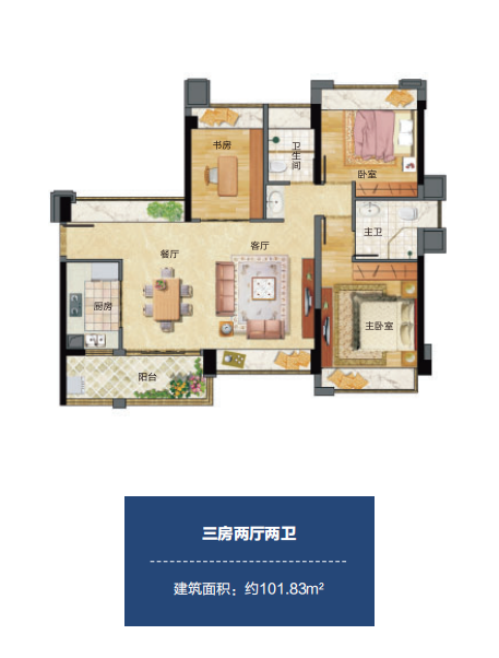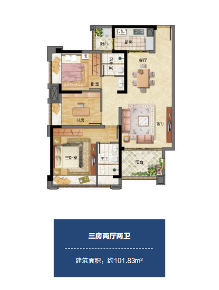 约102㎡三房两厅两卫产品,采用横厅设计,客厅与餐厅一线通达,全明气派,室内阳光流连。大阳台、多飘窗设计,南北通透,三面景观视野,观山瞰海,尽享生活。