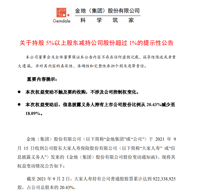 大家人寿累计减持金地集团股份2.34% ,降至18.09%
