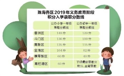 本报讯 记者廖明山 王晓君报道:记者从香洲区教育局获悉,昨天该局在“香洲区政府公众信息网”公布了2019年秋季香洲区公办中小学积分入学录取分数线:小学一年级积分入学录取分数线149分;初中一年级积分入学录取分数线120分。