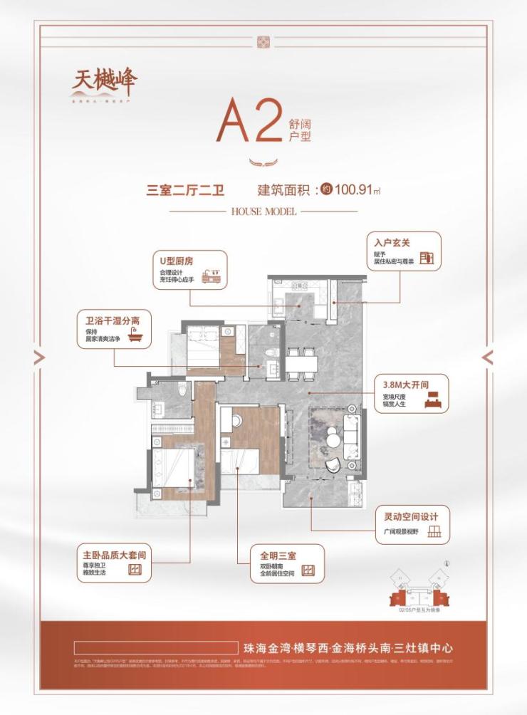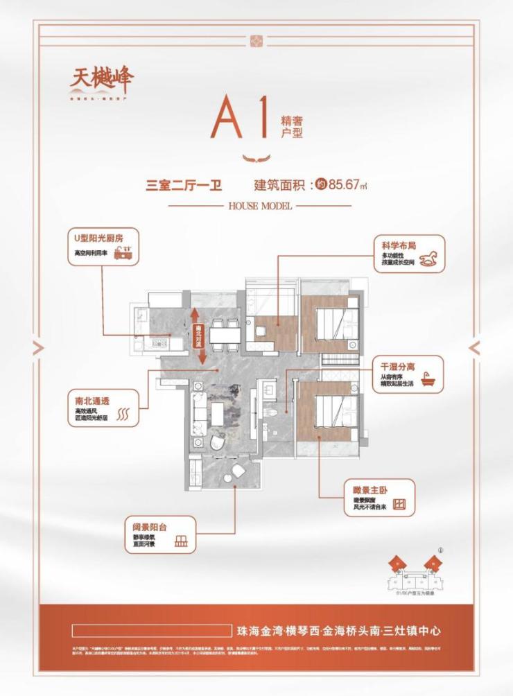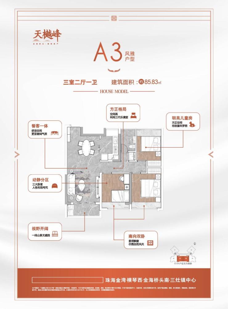 由天樾峰公馆倾力敬献珠海的产品,涵盖85.67三房两厅一卫、85.83㎡三房两厅一卫、100.91㎡三房两厅两卫三个户型,专为成长性家庭而准备。