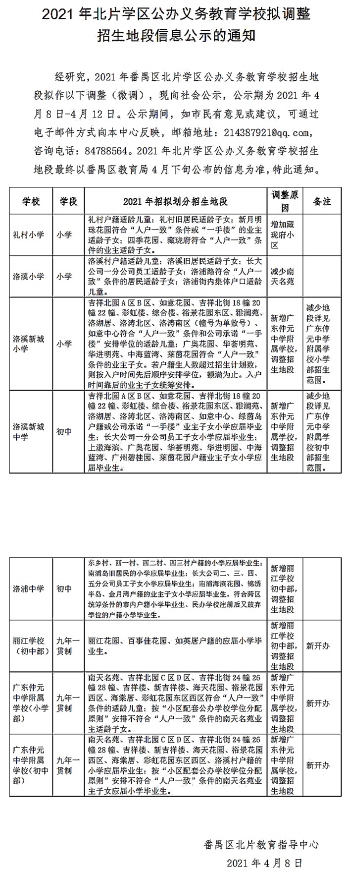 今天(4月8日),羊城晚报全媒体记者收到热心网友爆料称,番禺区北片教育指导中心在附近小区公布了《2021年北片学区公办义务教育学校拟调整招生地段信息公示的通知》(下简称“通知”),通知公示了今年新开学的丽江学校(初中部)、广东仲元中学附属学校(小学部)及广东仲元中学附属学校(中学部)的地段范围。因新学校的开学以及新小区的入住,礼村小学、洛溪小学等五所学校的地段也进行了微调,见下图↓