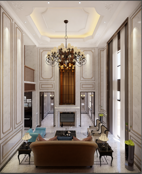 巨大的挑高空间,彷佛没有边界地蔓延开。大理石铺贴的墙面,辅以各种边框、线条或雕花造型,给整个别墅带来精彩又有序的空间艺术感。