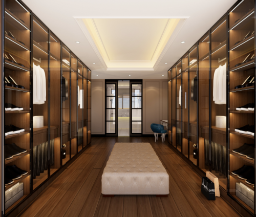卧室衣帽间为传家木工厂定制,生态板柜体+生态哑光烤漆门/铝框玻璃门的搭配,引领着这几平方空间的时尚。