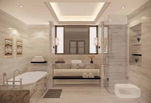 浴室均采用大花白大理石铺贴,清新爽朗。将浴缸放满,卸下一天的心事,洗净一身风霜。