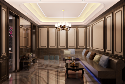 KTV娱乐房中,罗马印象大理石地面材质以它特有的曲线纹理,带来一种流动而轻松的质感,中和了墙面木饰线条造型的硬朗。