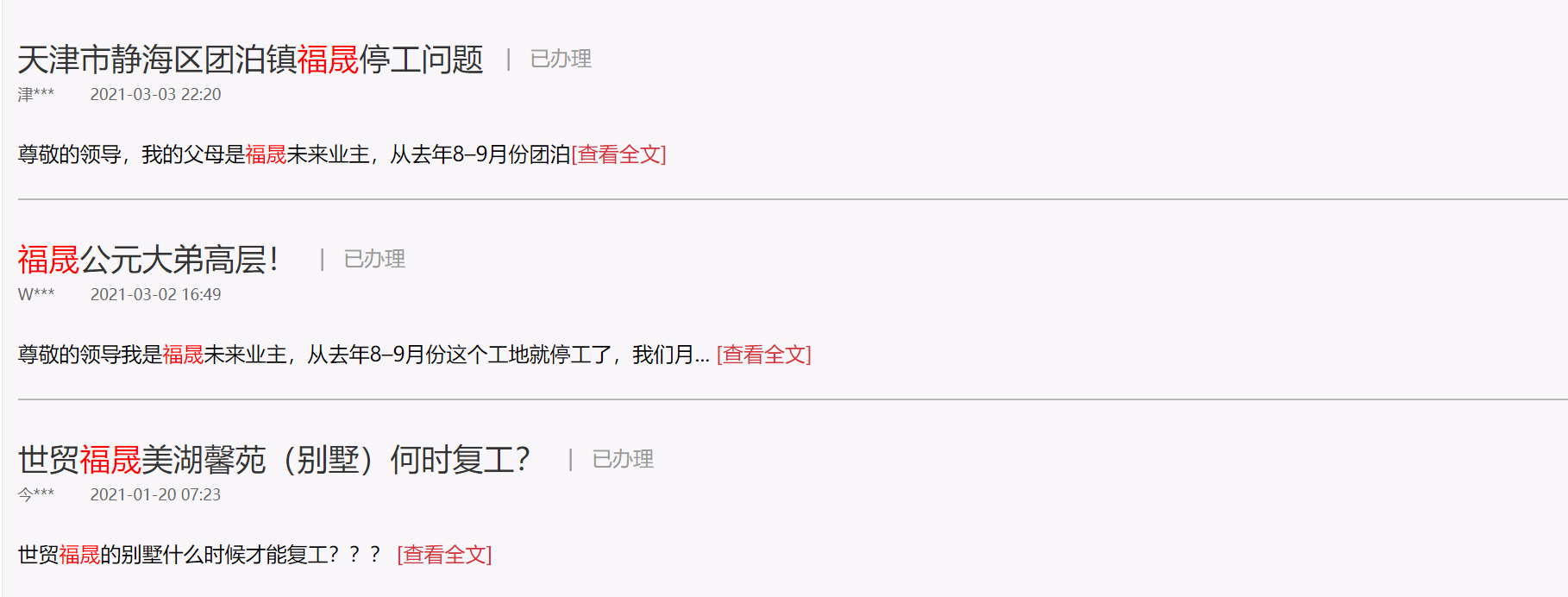 不过今年以来,在人民网领导留言板上,福晟旗下位于天津、漳州等地的楼盘项目仍频遭业主投诉,存在“延期复工”和“无法交付”等问题。