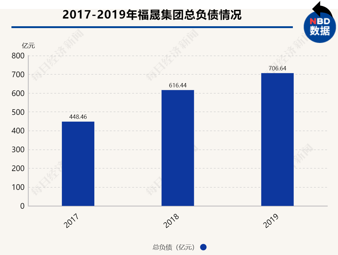 2017-2019年,福晟集团总负债分别为448.46亿元、616.44亿元、706.64亿元,负债规模持续上涨。