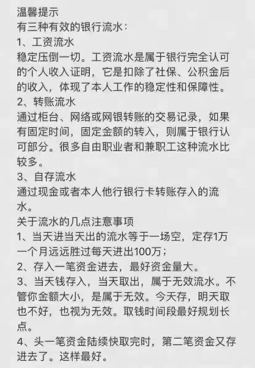 不少中介发出详细“科普贴”,称有三种有效的银行流水,分别为工资、转账和自存流水。
