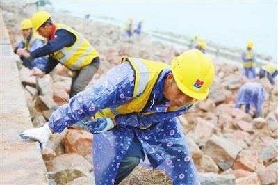记者走访当日阴雨阵阵,但在施工现场仍看到一片热火朝天的景象。“现在正值枯水期,比较适合最关键的水下工作这一块,所以我们在这段时间加紧时间进行施工,包括四角空心块安装等,之后才能开辟下一步的工作面,即进入风墙主体施工阶段。”项目负责人林锐彬向记者介绍,今年春节,项目部大部分人员留珠过年,项目现已全面复产。