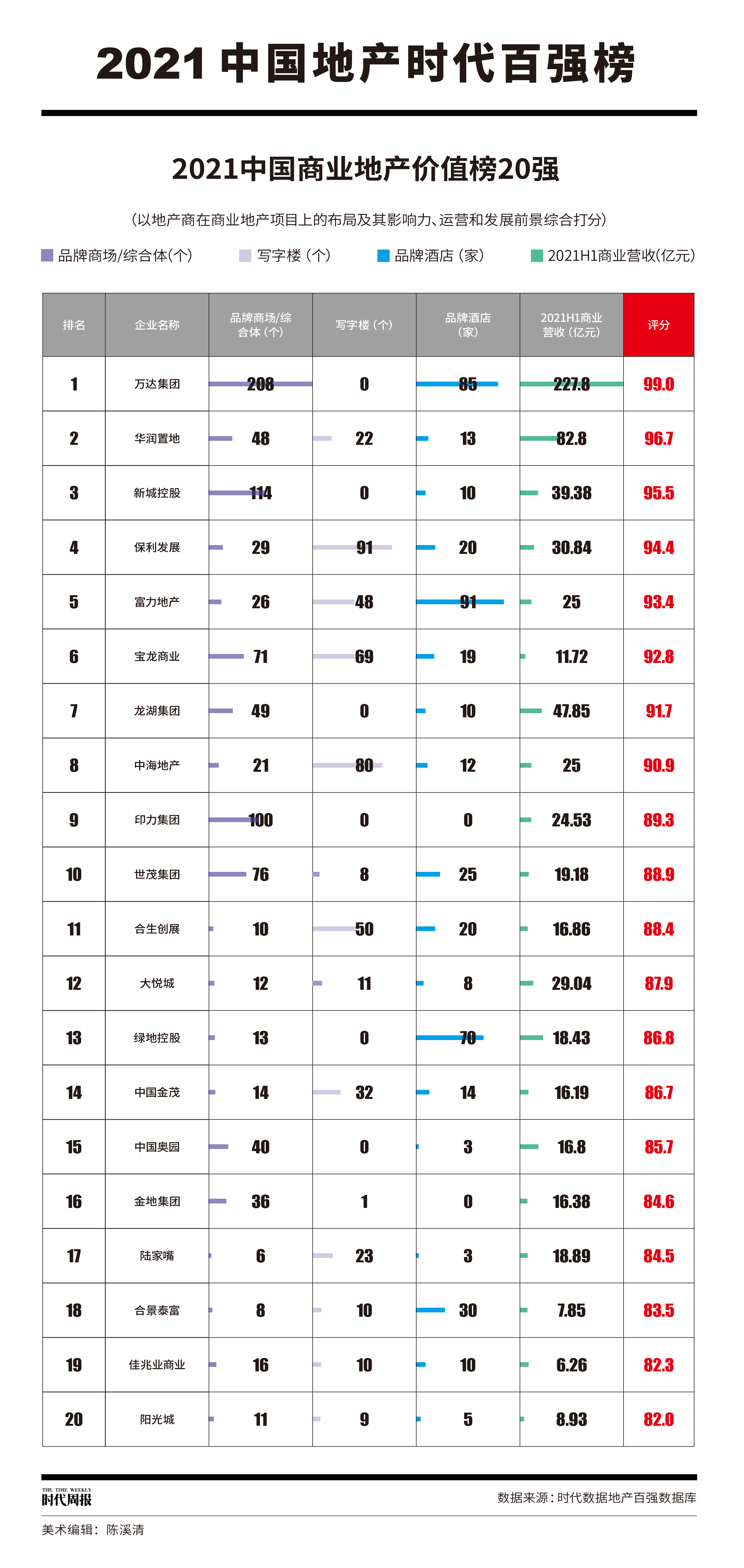 10月20日,时代传媒2021中国地产时代百强榜的子榜《2021中国商业地产价值榜20强》(下称《榜单》)重磅出炉。《榜单》依托时代传媒旗下的时代数据地产百强数据库,以地产商在商业地产项目上的布局及其影响力、运营方面和发展前景综合打分,以反映各家房地产企业的商业运营水平。