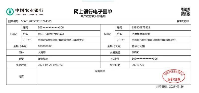 近日,河南省各地持续遭遇极端强降雨天气,防汛抗灾形势十分严峻。7月26日,惠达卫浴股份有限公司向河南省慈善总会捐赠100万元人民币,为防汛抢险和灾后重建工作贡献力量。