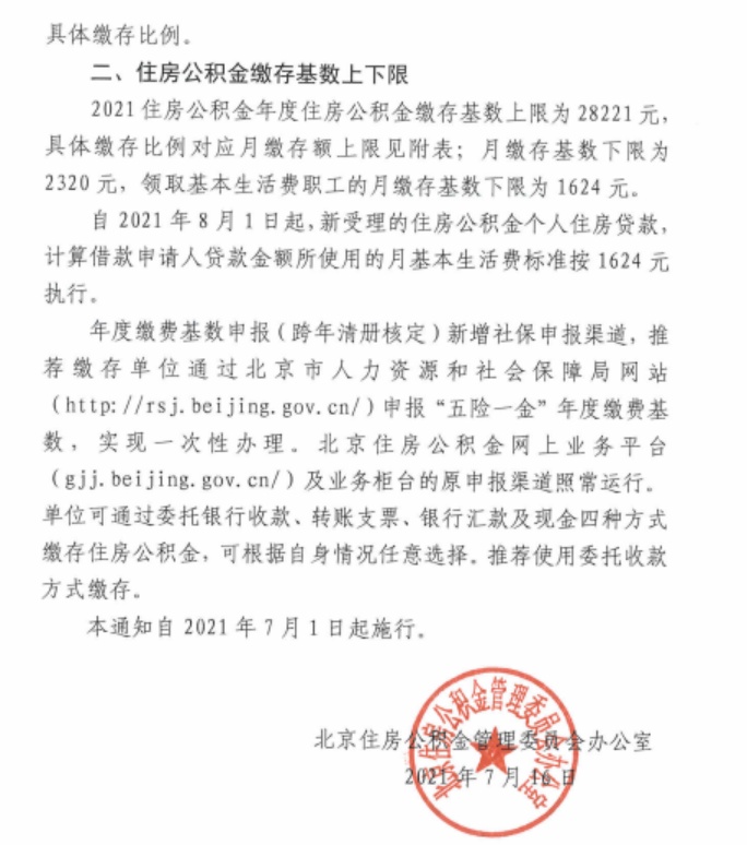 7月16日,北京住房公积金中心发布《关于2021住房公积金年度住房公积金缴存有关问题的通知》,2021住房公积金年度缴存基数上限为28221元,据此按照12%的缴存比例计算,较高每月可缴纳6774元公积金。据了解,2020年是沿用2019年度月缴存基数上限标准27786元。
