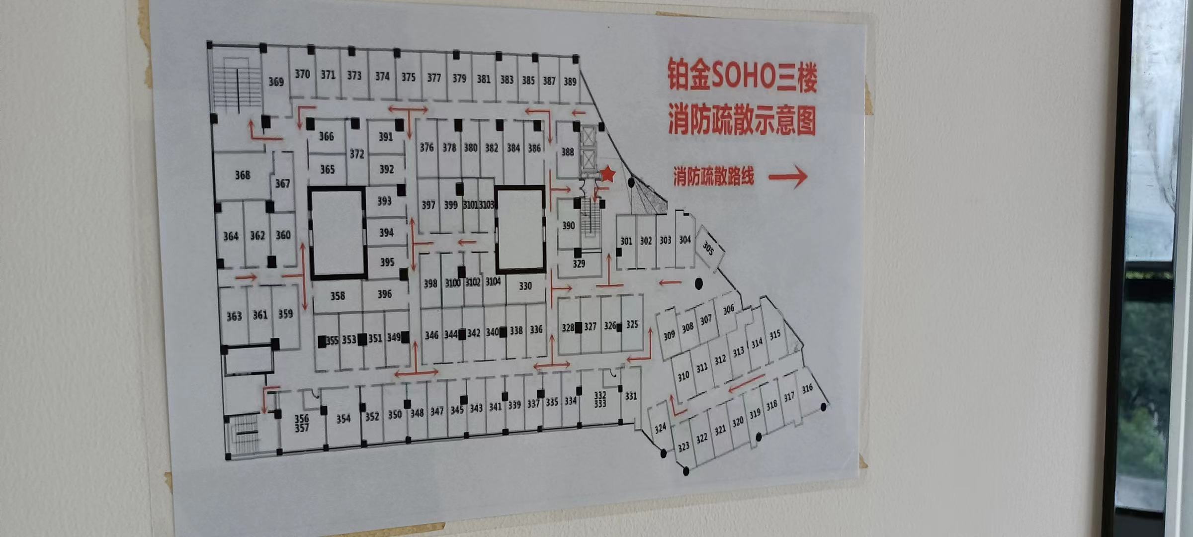 在电梯左侧,张贴着一张公寓消防疏散示意图。密密麻麻的一堆数字,分别对应每个房间,和大多数连锁酒店的布局相似。