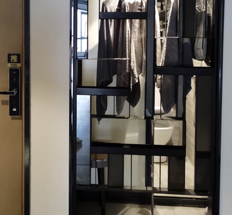 一番观察之后,卫生间和外部走廊的连接处,一个用黑色铁架隔出来的小空间引起了时代周报记者的注意。“铂金公寓很多房源没有明窗,这个位置算是内阳台,直接对着走廊,起到通风作用。”