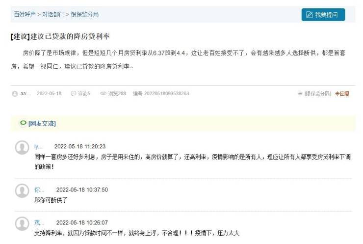 记者在洛阳网的百姓呼声栏目下发现,有数十位市民留言建议给存量房贷降低贷款利率。一位市民表示,短短几个月房贷利率从6.37%直接降到4.4%,让已经办理贷款正在还贷的老百姓接受不了。多位市民留言附和,表示疫情之下压力太大。