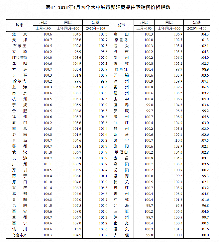 统计局:4月70大中城市中有62城新建商品住宅价格环比上涨,3月为62城;环比看,重庆涨幅1.4%领跑,北上广深分别涨0.6%、涨0.3%、涨1.1%、涨0.5%。