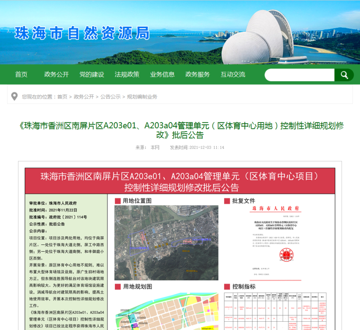 12月3日,珠海市自然资源局网公示了《珠海市香洲区南屏片区A203e01、A203a04管理单元(区体育中心用地)控制性详细规划修改批后公告》(后称《公告》)。据该《公告》信息所示,珠海南屏片区将迎来新的区体育中心项目。《公告》目前处于规划修改批复后公示阶段。