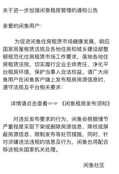 此前的4月6日,闲鱼曾发布一份《关于进一步加强闲鱼租房管理的通知公告》。公告指出,闲鱼加强租房管理,对违反发布要求的行为,将采取下架或删除房源信息、降权或屏蔽房源信息、限制发布等处罚措施。