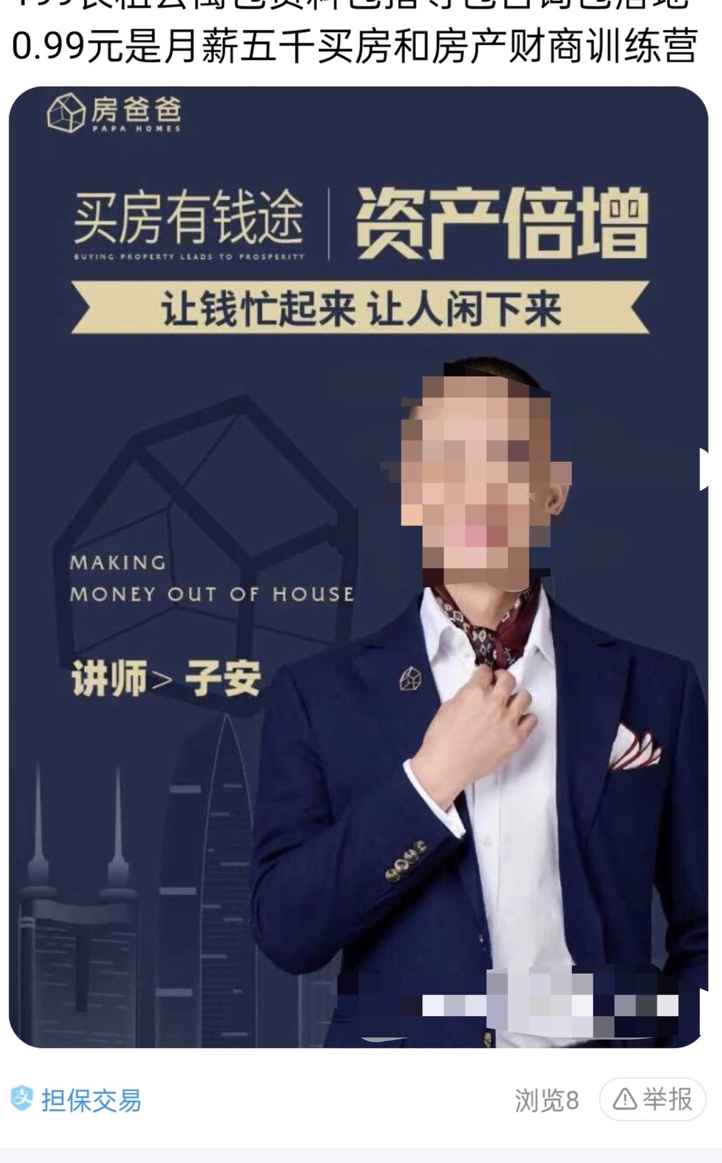 如果通过闲鱼搜索“买房”二字,多个宝贝链接便蹦了出来,都是一名叫“子安”的讲师在兜售课程,宣传语不乏“资产倍增”“买房有前途”“打完百万管道收入”等炒房诱导字眼。