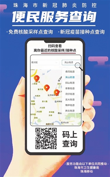 广大市民也可通过“珠海市新冠肺炎防控便民服务查询”平台查找距离自己最近的核酸采样点及新冠疫苗接种点。