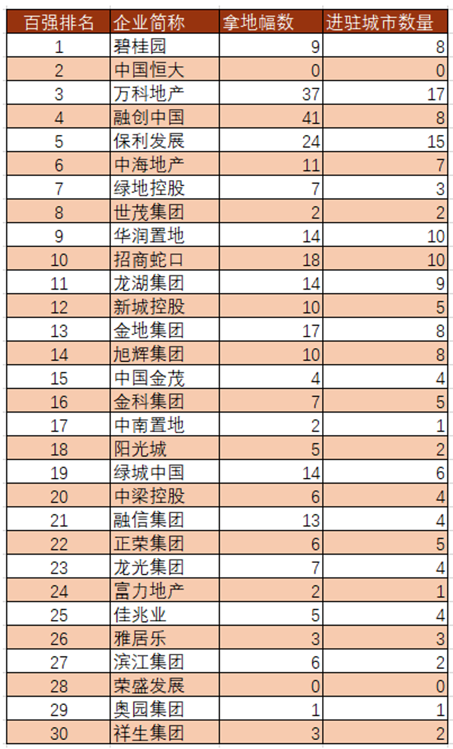 时代周报记者以TOP30房企为观察样本发现,虽然有踊跃拿地者如融创、融信,一天时间即可斩获7、8宗地块;但也有如奥园、富力、中南、世茂等房企,整轮集中供地下来,最终只有一两宗地入账;恒大、荣盛则全程零斩获,甚至未出现在土拍现场。