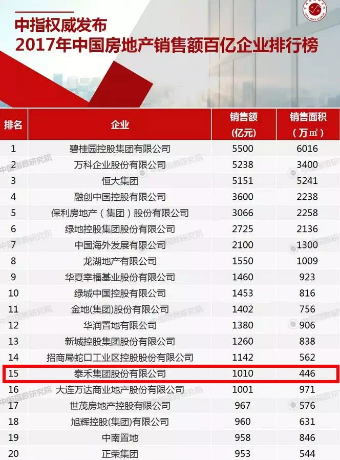 12月29日,中国指数研究院等权威机构联合发布了《2017年中国房地产销售额百亿企业排行榜》。其中,泰禾集团以1010亿元的销售成绩,强势跻身中国房企15强。