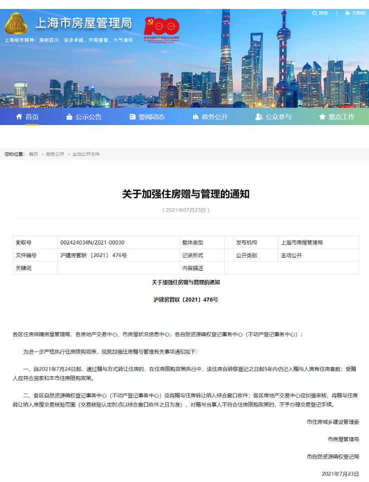 7月23日晚间,上海市住房城乡建设管理委、市房管局、市自然资源确权登记局联合出台《关于加强住房赠与管理的通知》。通知规定,自2021年7月24日起,通过赠与方式转让住房的,将被纳入限购范围,并记入赠与人拥有住房套数。