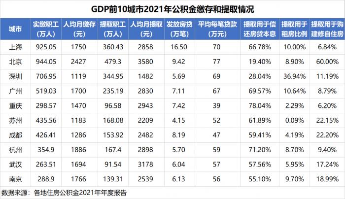 记者以2021年GDP排名前10城市,即上海、北京、深圳、广州、重庆、苏州、成都、杭州、武汉、南京为例,对其公积金2021年年度报告中缴存、提取和贷款情况进行梳理,分析其数据差异原因及与近期政策的联系。
