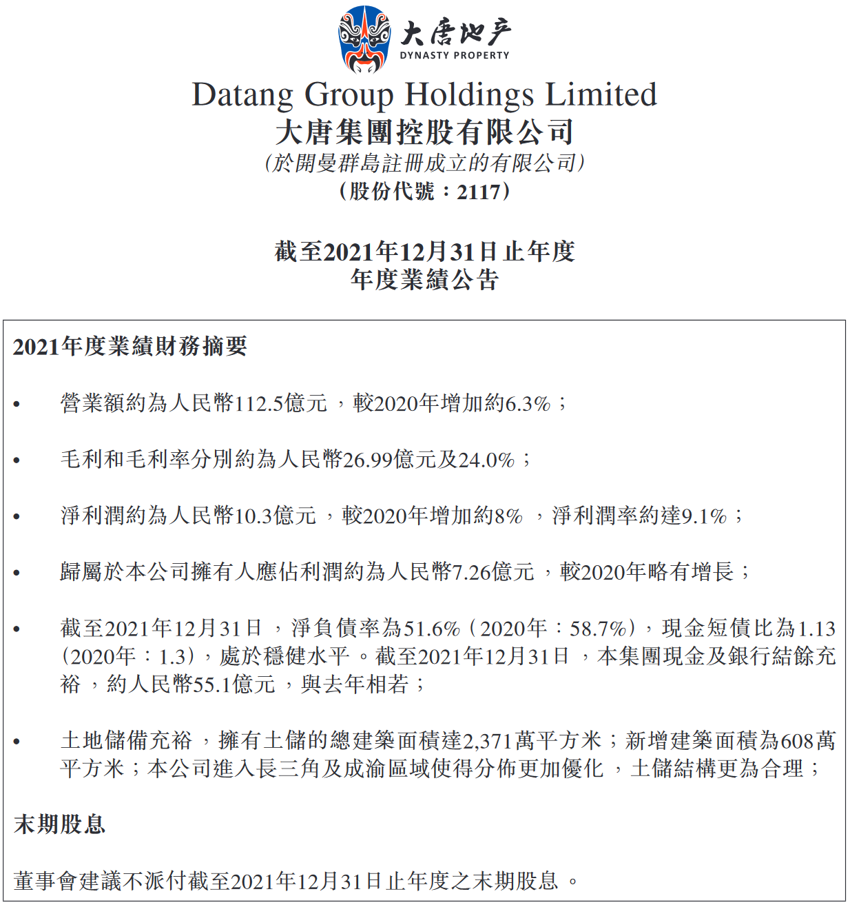3月30日晚间,大唐地产发布经普华永道审计确认的2021年度业绩报告。