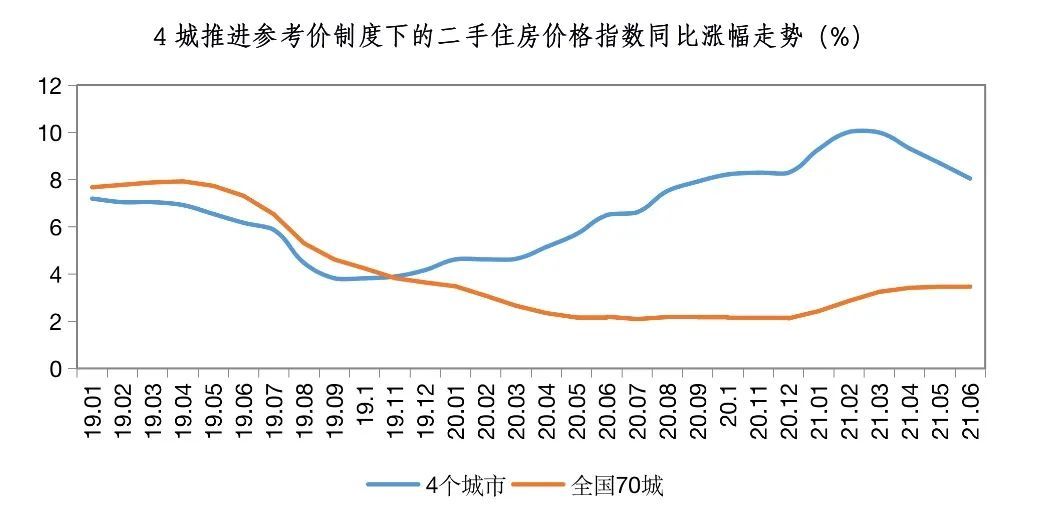 到了2021年2月份,该曲线处于顶部,4城二手住房价格指数同比涨幅为10.0%,且明显高于全国70城的平均水平。到了6月底,4城二手住房价格指数同比涨幅为8.1%,相比2月份的水平已压缩了两个百分点。