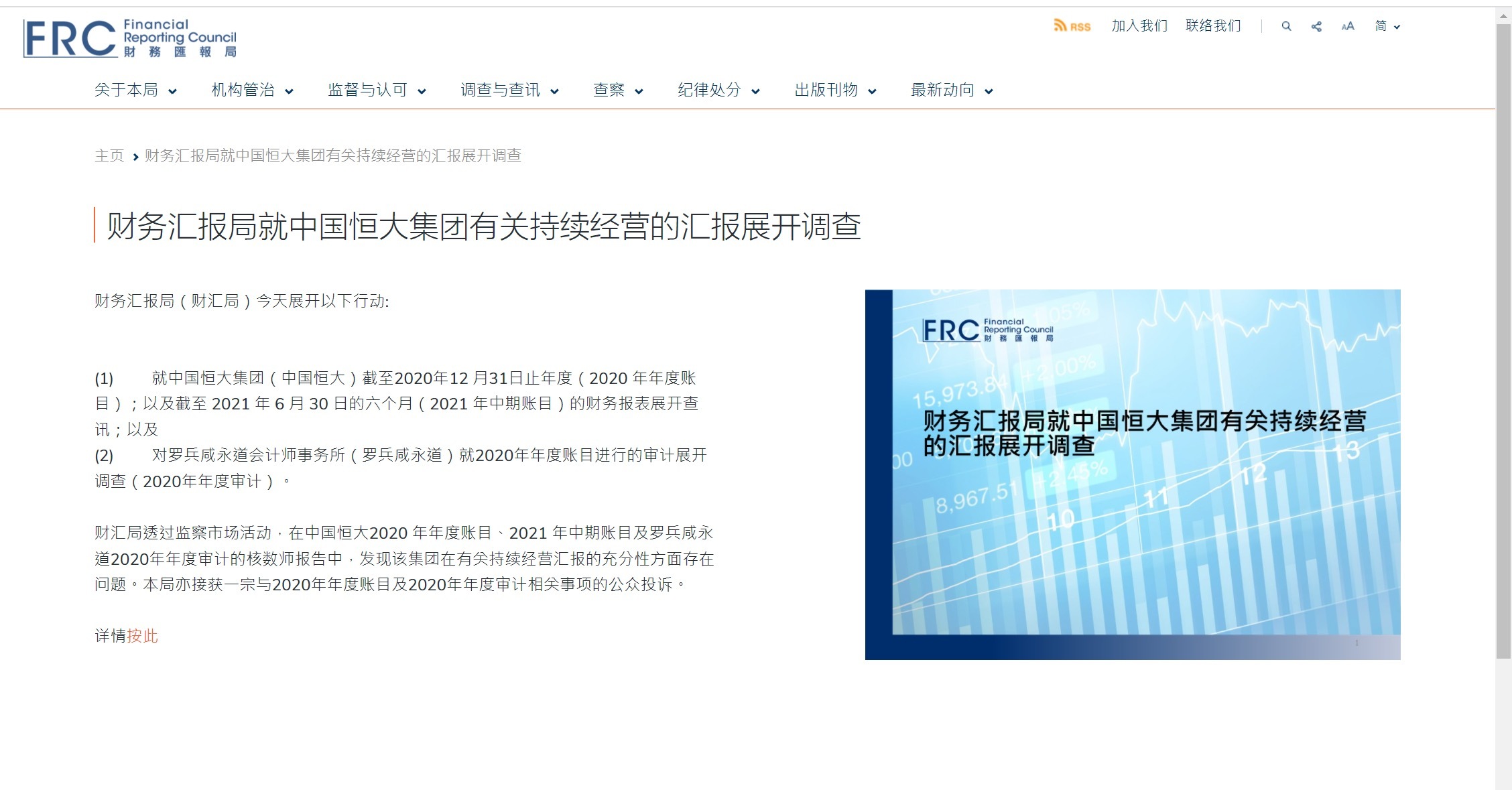 10月15日,香港财务汇报局发布一则公告《财务汇报局就中国恒大集团有关持续经营的汇报展开调查》(以下简称《调查》)。(注:财务汇报局是香港全面及独立的上市实体核数师监管机构,致力维持香港上市实体财务汇报的质素,从而加强对投资者的保障及提高投资者对企业汇报的信心)。